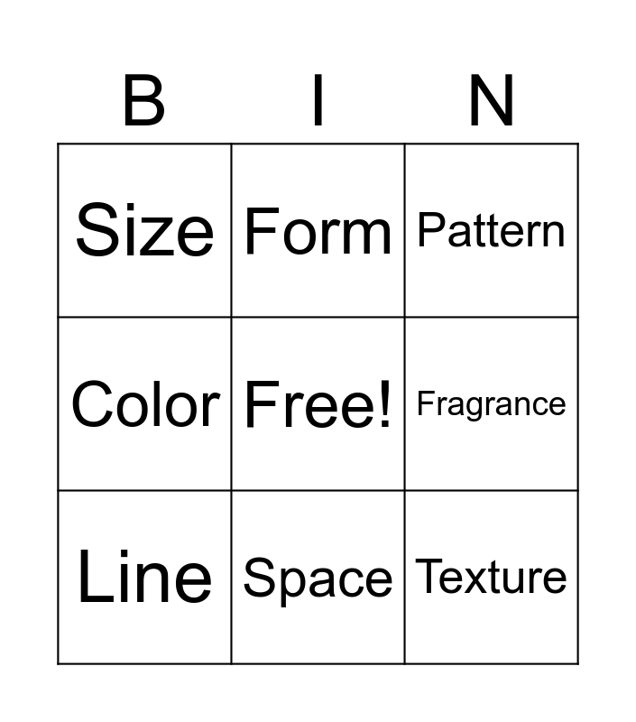 This bingo card has a free space and 8 words: Color, Form, Fragrance, Line, Pattern, Size, Space and Texture.