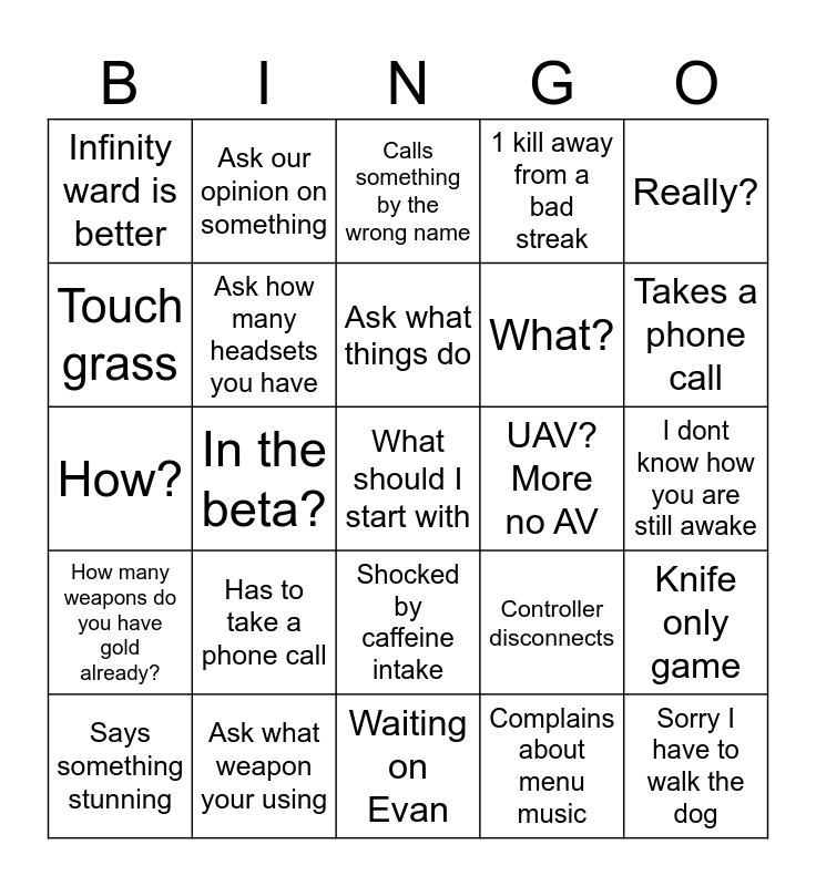 This bingo card has a free space and 32 words: Complains about menu music, Gets .2 KD, In the beta?, Ask our level, How many weapons do you have gold already?, Ask how many headsets you have, Really?, Knife only game, Ask our opinion on something, Have you used double xp, Ask what things do, Calls something by the wrong name, Compares to last year menu music, Hows zombies?, UAV? More no AV, Complains about hitting with launchers, Says something stunning, How?, Shocked by caffeine intake, Has to take a phone call, Controller disconnects, Who's ready for coop campaign, I dont know how you are still awake, Ask what weapon your using, Sorry I have to walk the dog, 1 kill away from a bad streak, What?, Touch grass, Infinity ward is better, Waiting on Evan, Can we back out and Takes a phone call.