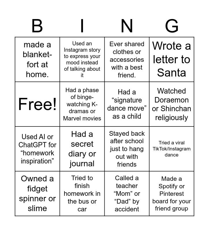 This bingo card has 16 words: Tried to finish homework in the bus or car, Tried a viral TikTok/Instagram dance, Ever shared clothes or accessories with a best friend., made a blanket-fort at home., Used AI or ChatGPT for “homework inspiration”, Used an Instagram story to express your mood instead of talking about it, Stayed back after school just to hang out with friends, Called a teacher “Mom” or “Dad” by accident, Free!, Had a phase of binge-watching K-dramas or Marvel movies, Owned a fidget spinner or slime, Wrote a letter to Santa, Had a secret diary or journal, Watched Doraemon or Shinchan religiously, Had a “signature dance move” as a child and Made a Spotify or Pinterest board for your friend group.