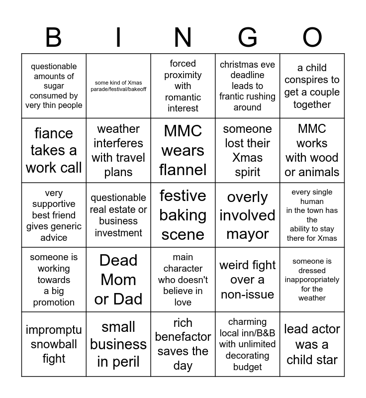 This bingo card has a free space and 24 words: Dead Mom or Dad, small business in peril, MMC wears flannel, impromptu snowball fight, a child conspires to get a couple together, questionable amounts of sugar consumed by very thin people, fiance takes a work call, some kind of Xmas parade/festival/bakeoff, overly involved mayor, main character who doesn't believe in love, someone lost their Xmas spirit, very supportive best friend gives generic advice, weird fight over a non-issue, someone is dressed inapporopriately for the weather, weather interferes with travel plans, charming local inn/B&B with unlimited decorating budget, every single human in the town has the ability to stay there for Xmas, forced proximity with romantic interest, MMC works with wood or animals, questionable real estate or business investment, lead actor was a child star, someone is working towards a big promotion, christmas eve deadline leads to frantic rushing around and rich benefactor saves the day.