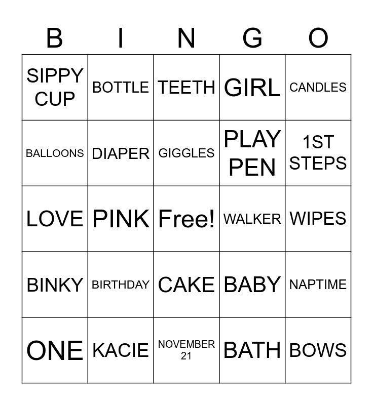 This bingo card has a free space and 24 words: BIRTHDAY, KACIE, GIGGLES, ONE, CANDLES, SIPPY CUP, BALLOONS, BOTTLE, WALKER, CAKE, PLAY PEN, LOVE, BABY, NAPTIME, DIAPER, BATH, WIPES, TEETH, 1ST STEPS, PINK, BOWS, BINKY, GIRL and NOVEMBER 21.