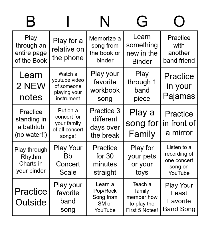 This bingo card has a free space and 24 words: Play Your Bb Concert Scale, Play your favorite band song, Play your favorite workbook song, Practice Outside, Practice with another band friend, Play through an entire page of the Book, Learn 2 NEW notes, Play for a relative on the phone, Play a song for Family, Practice for 30 minutes straight, Play through 1 band piece, Practice standing in a bathtub (no water!!), Play for your pets or your toys, Listen to a recording of one concert song on YouTube, Watch a youtube video of someone playing your instrument, Teach a family member how to play the First 5 Notes!, Practice in front of a mirror, Memorize a song from the book or binder, Practice in your Pajamas, Put on a concert for your family of all concert songs!, Play Your Least Favorite Band Song, Play through Rhythm Charts in your binder, Learn something new in the Binder and Learn a Pop/Rock Song from SM or YouTube.