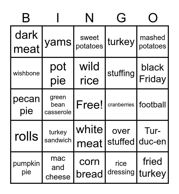 This bingo card has a free space and 28 words: Tur-duc-en, gravy, stuffing, rice dressing, wishbone, sweet potatoes, yams, rolls, cranberries, pumpkin pie, pecan pie, turkey, mac and cheese, corn bread, black Friday, left overs, turkey sandwich, pot pie, wild rice, white meat, dark meat, drumstick, fried turkey, green bean casserole, football, over stuffed, mashed potatoes and gobble gobble.