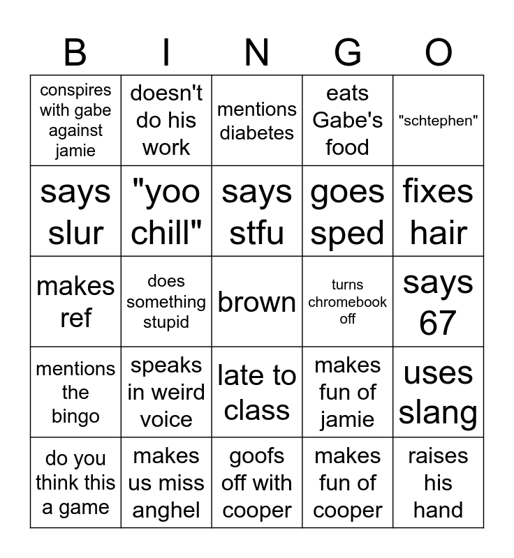 This bingo card has a free space and 24 words: speaks in weird voice, makes us miss anghel, says stfu, do you think this a game, "schtephen", conspires with gabe against jamie, says slur, doesn't do his work, turns chromebook off, late to class, goes sped, makes ref, makes fun of jamie, uses slang, "yoo chill", makes fun of cooper, says 67, mentions diabetes, fixes hair, does something stupid, raises his hand, mentions the bingo, eats Gabe's food and goofs off with cooper.
