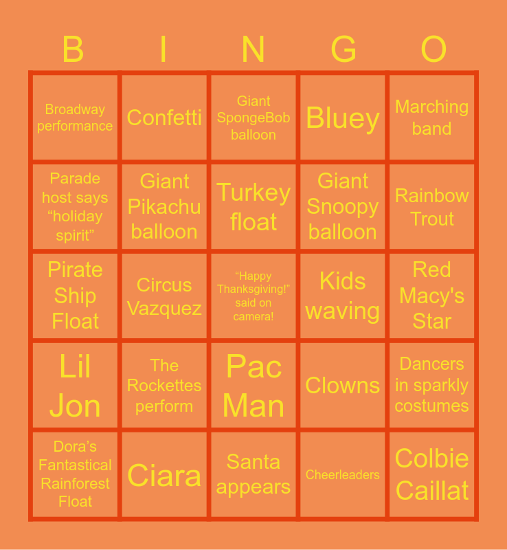 This bingo card has a free space and 24 words: The Rockettes perform, Ciara, Turkey float, Dora’s Fantastical Rainforest Float, Marching band, Broadway performance, Parade host says “holiday spirit”, Confetti, Kids waving, Pac Man, Giant Snoopy balloon, Pirate Ship Float, Clowns, Dancers in sparkly costumes, Giant Pikachu balloon, Cheerleaders, Red Macy's Star, Giant SpongeBob balloon, Rainbow Trout, Circus Vazquez, Colbie Caillat, Lil Jon, Bluey and Santa appears.