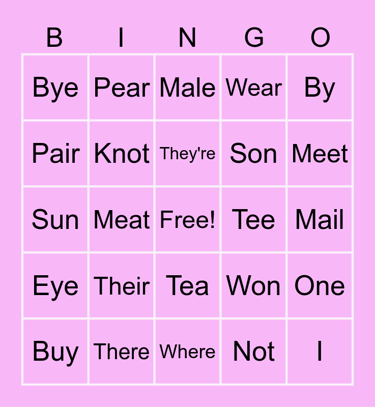 This bingo card has a free space and 24 words: Their, There, They're, Buy, By, Bye, Pair, Pear, Tee, Tea, Son, Sun, Won, One, Knot, Not, Mail, Male, Meet, Meat, I, Eye, Wear and Where.
