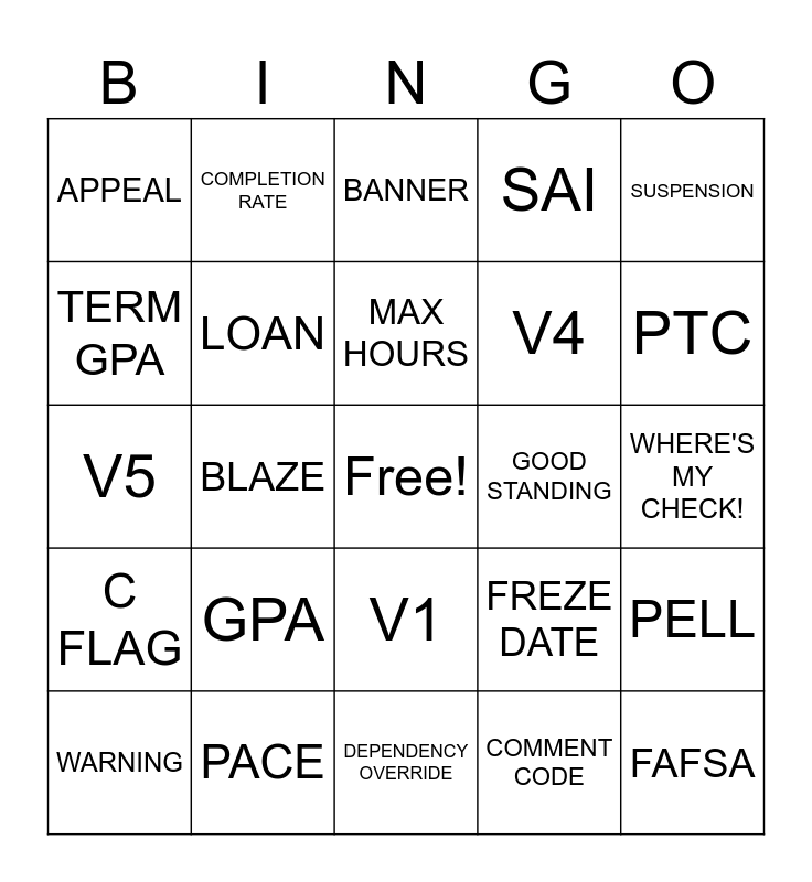 This bingo card has a free space and 24 words: GPA, PACE, MAX HOURS, WARNING, SUSPENSION, APPEAL, TERM GPA, COMPLETION RATE, GOOD STANDING, V1, V4, V5, FREZE DATE, PELL, LOAN, COMMENT CODE, WHERE'S MY CHECK!, BANNER, PTC, BLAZE, FAFSA, C FLAG, SAI and DEPENDENCY OVERRIDE.