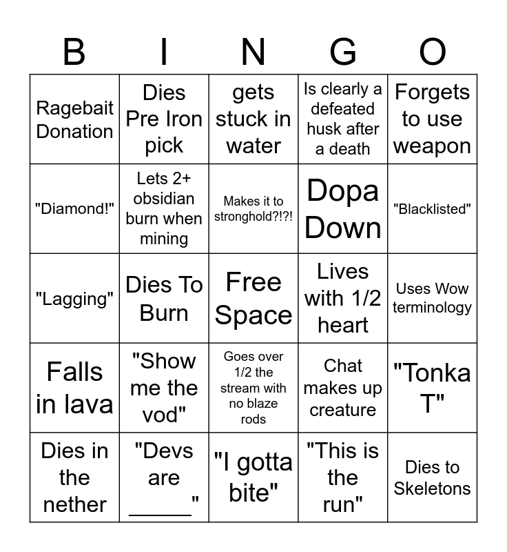 This bingo card has a free space and 34 words: Blames Chat for Death, "This is the run", Miss-places Block on nether portal, Dies to fall damage, Falls in lava, Lets 2+ obsidian burn when mining, Forgets to use weapon, Dies in the nether, Dies Pre Iron pick, 1v1'd by a single mob, Makes it to stronghold?!?!, gets stuck in water, Gets bored and resets, Throws good seed, Lives with 1/2 heart, "Blacklisted", "Devs are _____", "Lagging", "Show me the vod", Chat makes up creature, Goes over 1/2 the stream with no blaze rods, Uses League Terminology, Ragebait Donation, Uses Wow terminology, "I gotta bite", Dies to Skeletons, Is clearly a defeated husk after a death, Names the world, Dopa Down, "Diamond!", "Bug", Dies To Burn, "Tonka T" and "You Little Freaks".