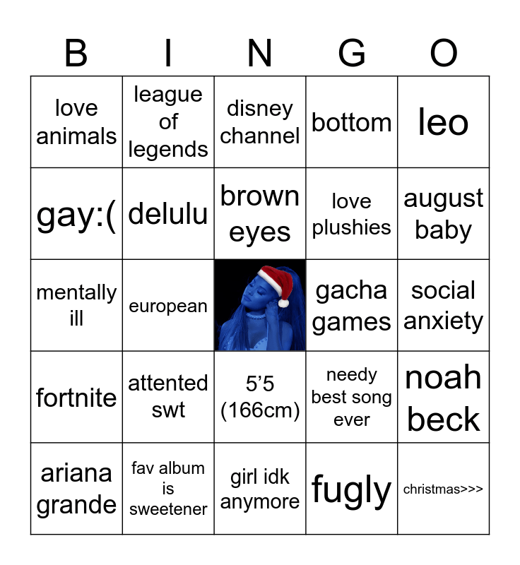 This bingo card has a free space and 24 words: attented swt, fav album is sweetener, brown eyes, ariana grande, leo, love animals, gay:(, league of legends, gacha games, 5’5 (166cm), love plushies, mentally ill, needy best song ever, noah beck, delulu, fugly, social anxiety, disney channel, august baby, european, christmas>>>, fortnite, bottom and girl idk anymore.