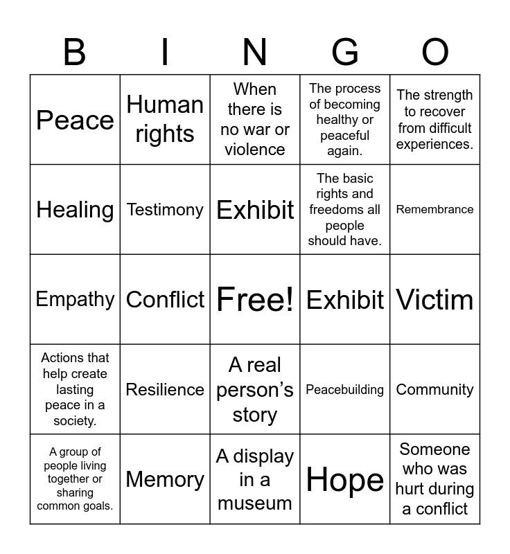 This bingo card has a free space and 30 words: Memory, Something we remember from the past, Conflict, Fighting between groups or people, Peace, When there is no war or violence, Testimony, A real person’s story, Exhibit, A display in a museum, Victim, Someone who was hurt during a conflict, Hope, Feeling that the future can be better, Remembrance, The act of remembering and honoring the past., Peacebuilding, Actions that help create lasting peace in a society., Resilience, The strength to recover from difficult experiences., Empathy, The ability to understand and share another person’s feelings., Human rights, The basic rights and freedoms all people should have., Healing, The process of becoming healthy or peaceful again., Community, A group of people living together or sharing common goals., Exhibit and A public display of objects, art, or information..
