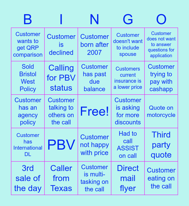 This bingo card has a free space and 24 words: PBV, Caller from Texas, Customer has past due balance, 3rd sale of the day, Customer does not want to answer questions for application, Customer wants to get QRP comparison, Sold Bristol West Policy, Customer is declined, Customer is asking for more discounts, Customer not happy with price, Customers current insurance is a lower price, Customer has an agency policy, Had to call ASSIST on call, Third party quote, Calling for PBV status, Direct mail flyer, Quote on motorcycle, Customer born after 2007, Customer trying to pay with cashapp, Customer talking to others on the call, Customer eating on the call, Customer has International DL, Customer doesn't want to include spouse and Customer is multi-tasking on the call.
