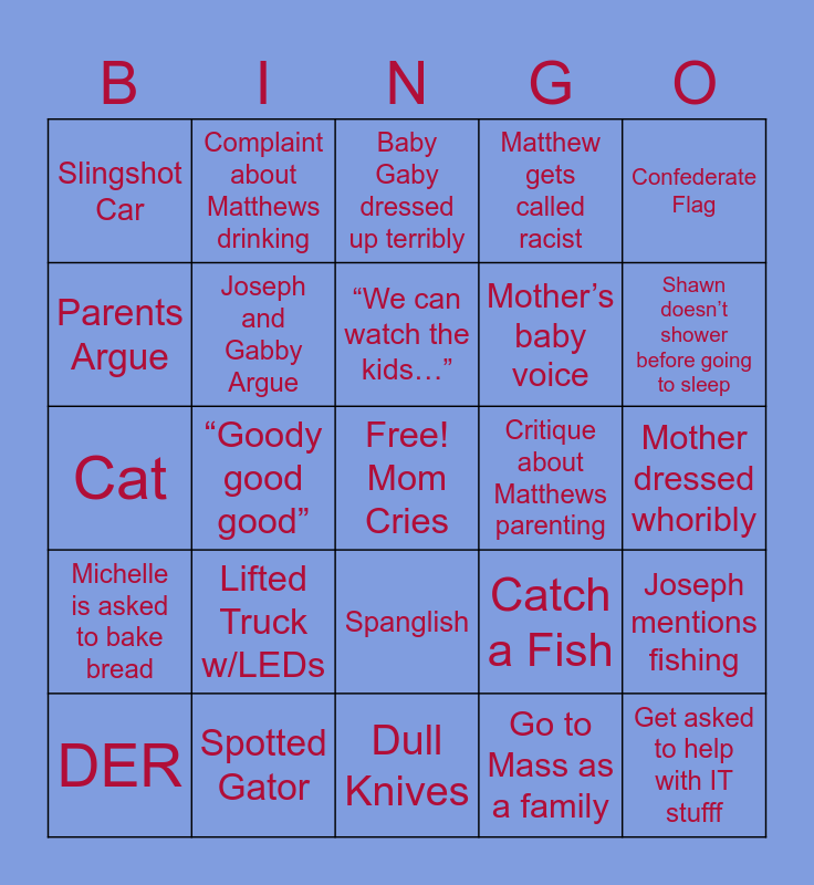 This bingo card has a free space and 24 words: Lifted Truck w/LEDs, Spotted Gator, “We can watch the kids…”, DER, Confederate Flag, Slingshot Car, Parents Argue, Complaint about Matthews drinking, Critique about Matthews parenting, Spanglish, Mother’s baby voice, Cat, Catch a Fish, Joseph mentions fishing, Joseph and Gabby Argue, Go to Mass as a family, Mother dressed whoribly, Baby Gaby dressed up terribly, Shawn doesn’t shower before going to sleep, “Goody good good”, Get asked to help with IT stufff, Michelle is asked to bake bread, Matthew gets called racist and Dull Knives.