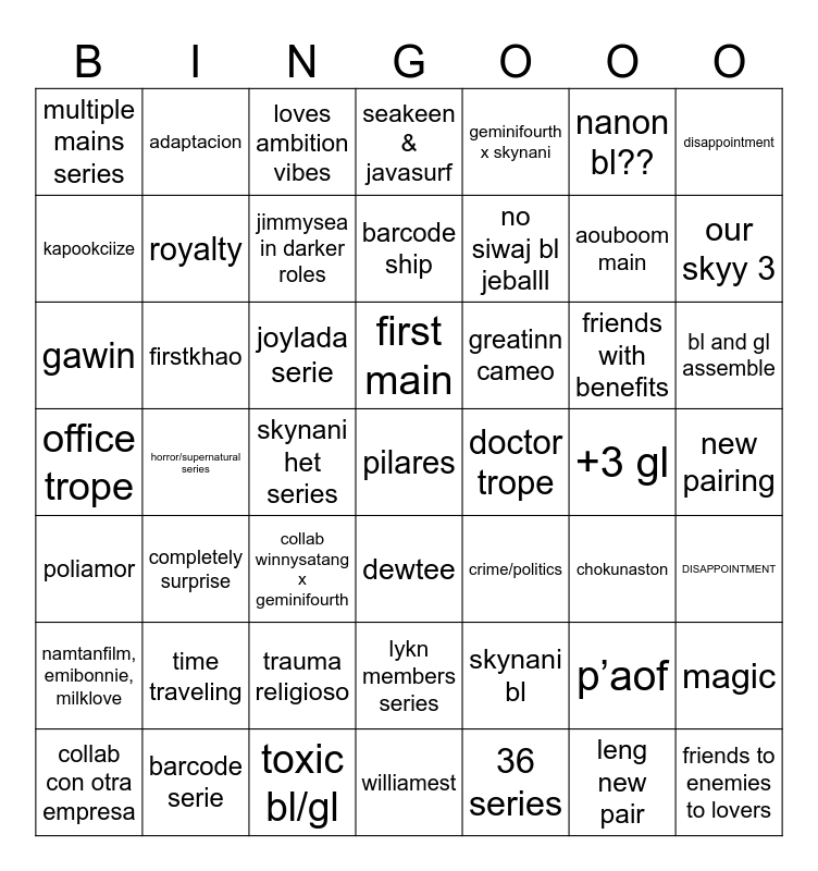 This bingo card has a free space and 48 words: skynani bl, aouboom main, williamest, horror/supernatural series, joylada serie, new pairing, adaptacion, barcode serie, nanon bl??, dewtee, disappointment, seakeen & javasurf, friends with benefits, greatinn cameo, namtanfilm, emibonnie, milklove, +3 gl, kapookciize, our skyy 3, p’aof, geminifourth x skynani, no siwaj bl jeballl, skynani het series, multiple mains series, royalty, magic, jimmysea in darker roles, bl and gl assemble, collab con otra empresa, first main, firstkhao, leng new pair, doctor trope, DISAPPOINTMENT, time traveling, office trope, crime/politics, chokunaston, gawin, collab winnysatang x geminifourth, trauma religioso, poliamor, friends to enemies to lovers, loves ambition vibes, toxic bl/gl, barcode ship, lykn members series, completely surprise and 36 series.