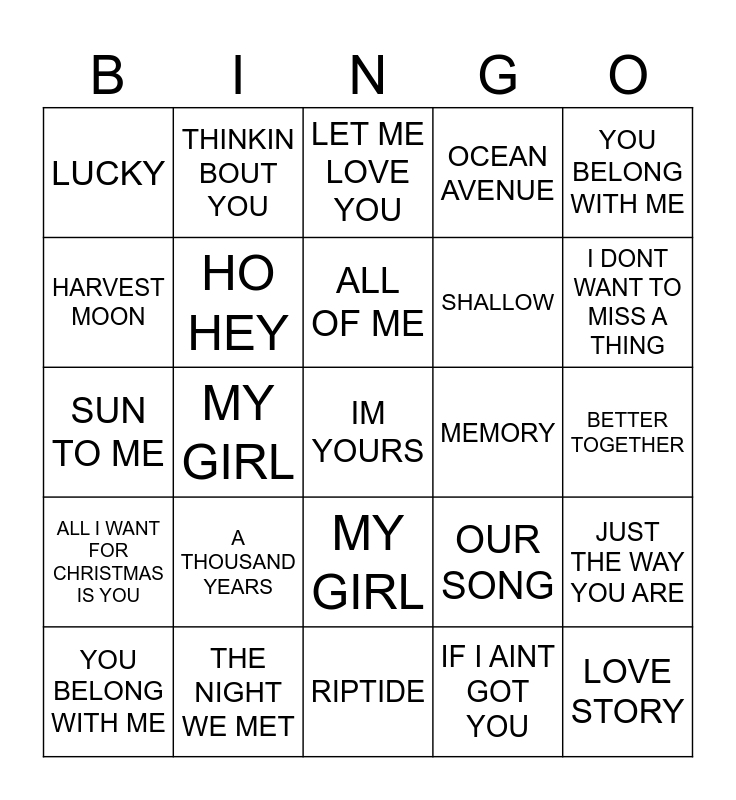 This bingo card has 42 words: I WILL FOLLOW YOU INTO THE DARK, ALL OF ME, MARRY YOU, A THOUSAND YEARS, IF I AINT GOT YOU, JUST THE WAY YOU ARE, IM YOURS, MY BOO, LET ME LOVE YOU, MY GIRL, BETTER TOGETHER, I DONT WANT TO MISS A THING, MY GIRL, YOU BELONG WITH ME, HEY THERE DELILAH, OUR SONG, IF THE WORLD WAS ENDING, SUN TO ME, LOSE CONTROL, THINKIN BOUT YOU, HARVEST MOON, YOU AND ME, LOVE STORY, LUCKY, BLEEDING LOVE, I WANNA BE YOURS, SHALLOW, AFTERNOON DELIGHT, BEAUTIFUL SOUL, BIRDS OF A FEATHER, BROWN EYED GIRL, ALL I WANT FOR CHRISTMAS IS YOU, HO HEY, RIPTIDE, KISS ME, YOU BELONG WITH ME, THE NIGHT WE MET, MEMORY, THE ROCK SHOW, INTO YOU, OCEAN AVENUE and ALIVE WITH THE GLORY.