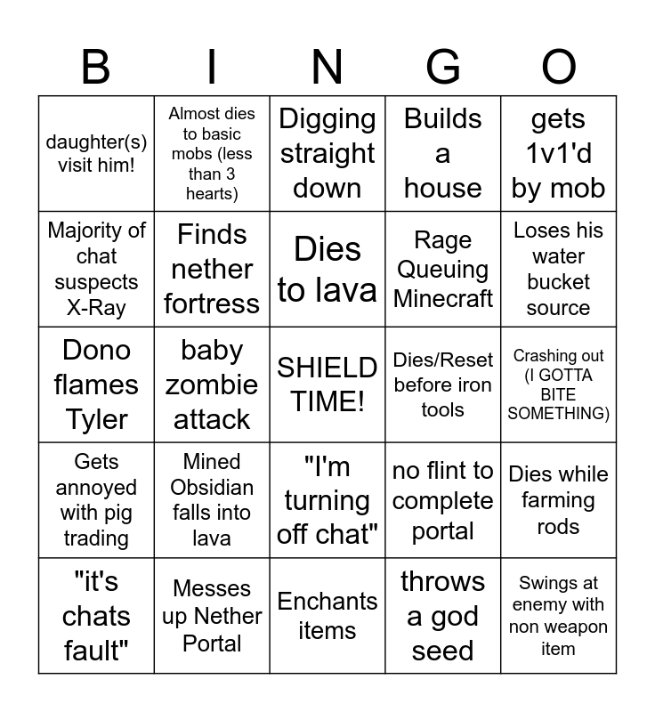 This bingo card has a free space and 24 words: Mined Obsidian falls into lava, Messes up Nether Portal, Dies to lava, "it's chats fault", gets 1v1'd by mob, daughter(s) visit him!, Majority of chat suspects X-Ray, Almost dies to basic mobs (less than 3 hearts), Dies/Reset before iron tools, "I'm turning off chat", Rage Queuing Minecraft, Dono flames Tyler, no flint to complete portal, Dies while farming rods, Finds nether fortress, throws a god seed, Crashing out (I GOTTA BITE SOMETHING), Digging straight down, Loses his water bucket source, baby zombie attack, Swings at enemy with non weapon item, Gets annoyed with pig trading, Builds a house and Enchants items.