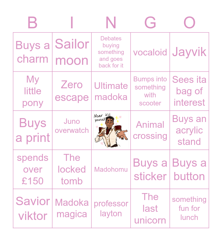 This bingo card has a free space and 24 words: The locked tomb, Madoka magica, Ultimate madoka, Savior viktor, Jayvik, Buys a charm, My little pony, Sailor moon, Animal crossing, Madohomu, Bumps into something with scooter, Buys a print, Buys a sticker, Buys a button, Zero escape, The last unicorn, Buys an acrylic stand, Debates buying something and goes back for it, Sees ita bag of interest, Juno overwatch, something fun for lunch, spends over £150, vocaloid and professor layton.