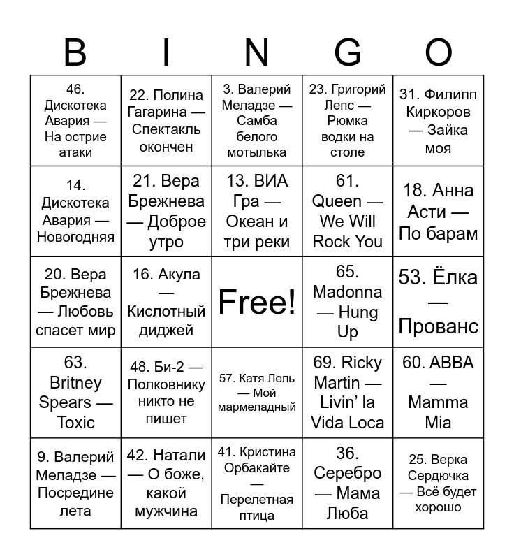 This bingo card has a free space and 74 words: 1. Валерий Меладзе — Сэра, 2. Валерий Меладзе — Красиво, 3. Валерий Меладзе — Самба белого мотылька, 4. Валерий Меладзе — Небеса, 5. Валерий Меладзе — Вера, 6. Валерий Меладзе — Свободный полет, 7. Валерий Меладзе — Иностранец, 8. Валерий Меладзе — Шикидым, 9. Валерий Меладзе — Посредине лета, 10. Валерий Меладзе — Салют, Вера, 11. ВИА Гра — Попытка №5, 12. ВИА Гра — Перемирие, 13. ВИА Гра — Океан и три реки, 14. Дискотека Авария — Новогодняя, 15. Демо — Солнышко, 16. Акула — Кислотный диджей, 17. 5 Fiesta Family — Зачем, 18. Анна Асти — По барам, 19. София Ротару — Хуторянка, 20. Вера Брежнева — Любовь спасет мир, 21. Вера Брежнева — Доброе утро, 22. Полина Гагарина — Спектакль окончен, 23. Григорий Лепс — Рюмка водки на столе, 24. Jazzdauren — Дарите женщинам цветы, 25. Верка Сердючка — Всё будет хорошо, 26. Многоточие — В жизни так бывает, 27. Руки Вверх — Крошка моя, 28. Иванушки International — Тополиный пух, 29. Ласковый май — Белые розы, 30. Алсу — Зимний сон, 31. Филипп Киркоров — Зайка моя, 32. Григорий Лепс — Самый лучший день, 33. Земфира — Хочешь?, 34. Звери — Районы-кварталы, 35. t.A.T.u. — Нас не догонят, 36. Серебро — Мама Люба, 37. Отпетые мошенники — Люби меня, люби, 38. Город 312 — Останусь, 39. МакSIM — Знаешь ли ты, 40. Ирина Аллегрова — Императрица, 41. Кристина Орбакайте — Перелетная птица, 42. Натали — О боже, какой мужчина, 43. Света — Другая, 44. Фабрика — Про любовь, 45. Потап и Настя — На районе, 46. Дискотека Авария — На острие атаки, 47. Жуки — Батарейка, 48. Би-2 — Полковнику никто не пишет, 49. Сплин — Моё сердце, 50. Мумий Тролль — Утекай, 51. Юрий Шатунов — Седая ночь, 52. Николай Басков — Шарманка, 53. Ёлка — Прованс, 54. Нюша — Выбирать чудо, 55. Hi-Fi — Седьмой лепесток, 56. Руслана — Дикі танці, 57. Катя Лель — Мой мармеладный, 58. Глюк’oZa — Невеста, 59. Океан Ельзи — Обійми, 60. ABBA — Mamma Mia, 61. Queen — We Will Rock You, 62. Michael Jackson — Billie Jean, 63. Britney Spears — Toxic, 64. Backstreet Boys — I Want It That Way, 65. Madonna — Hung Up, 66. Lady Gaga — Bad Romance, 67. Adele — Rolling in the Deep, 68. Shakira — Hips Don’t Lie, 69. Ricky Martin — Livin’ la Vida Loca, 70. Beyoncé — Single Ladies, 71. Rihanna — Umbrella, 72. Ed Sheeran — Shape of You, 73. Bruno Mars — Uptown Funk and 74. Pharrell Williams — Happy.
