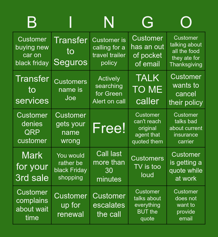 This bingo card has a free space and 24 words: You would rather be black Friday shopping, Customer up for renewal, Actively searching for Green Alert on call, Customer complains about wait time, Customer talking about all the food they ate for Thanksgiving, Customer buying new car on black friday, Transfer to services, Transfer to Seguros, Customer can't reach original agent that quoted them, Call last more than 30 minutes, TALK TO ME caller, Customer denies QRP customer, Customers TV is too loud, Customer is getting a quote while at work, Customers name is Joe, Customer talks about everything BUT the quote, Customer talks bad about current insurance carrier, Customer is calling for a travel trailer policy, Customer wants to cancel their policy, Customer gets your name wrong, Customer does not want to provide email, Mark for your 3rd sale, Customer has an out of pocket of email and Customer escalates the call.