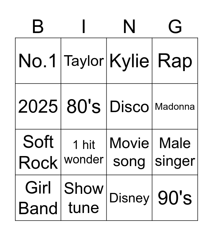 This bingo card has 16 words: Show tune, Male singer, Kylie, No.1, Soft Rock, Taylor, Movie song, Disney, 2025, 80's, Girl Band, Rap, 1 hit wonder, Madonna, Disco and 90's.