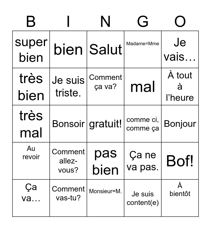 This bingo card has a free space and 24 words: Comment allez-vous?, Comment vas-tu?, Comment ça va?, Ça va…, Je vais…, super bien, très bien, bien, comme ci, comme ça, pas bien, mal, très mal, Ça ne va pas., Bof!, Je suis triste., Je suis content(e), Bonjour, Salut, À tout à l’heure, Bonsoir, À bientôt, Au revoir, Madame=Mme and Monsieur=M..