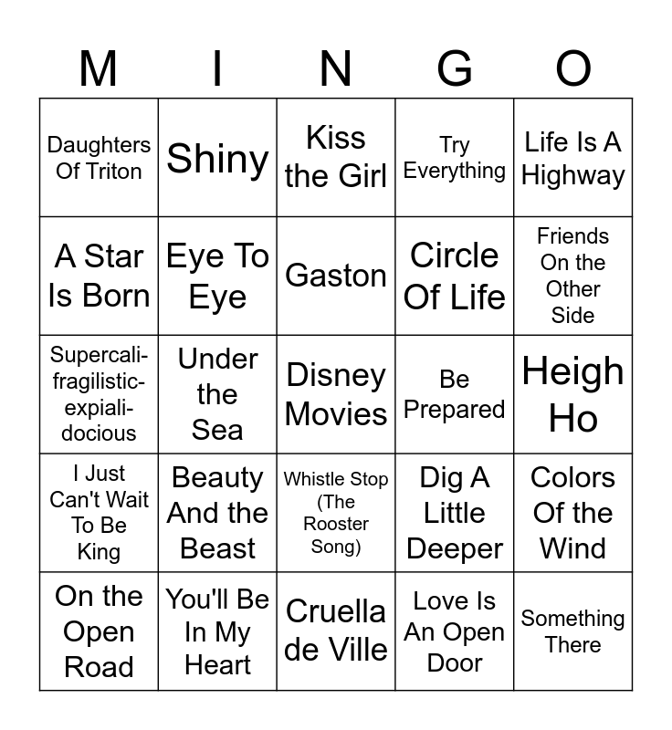 This bingo card has a free space and 70 words: Do Re Mi, Heigh Ho, When You Wish Upon A Star, When Will My Life Begin, You'll Be In My Heart, Prince Ali, Try Everything, Route 66, Life Is A Highway, Bibbidi Bobbidiboo, Colors Of the Wind, Whole New World, Daughters Of Triton, Kiss the Girl, Part Of Your World, Under the Sea, Whistle Stop (The Rooster Song), Circle Of Life, Hakuna Matata, I Just Can't Wait To Be King, Be Prepared, Dig A Little Deeper, Friends On the Other Side, Almost There, We Don't Talk About Bruno, Surface Pressure, In Summer, Let It Go, Love Is An Open Door, How Far I'll Go, Shiny, You're Welcome, If I Didn't Have You, I'll Make A Man Out Of You, You've Got A Friend, Bare Necessities, I Wanna Be Like You, That's What Friends Are For, Zero To Hero, A Star Is Born, Be Our Guest, Beauty And the Beast, Something There, The Time Of Your Life, After Today, Eye To Eye, On the Open Road, Stand Out, Bella Notte, He's A Tramp, Hawaiian Roller Coaster, One Jump Ahead, Remember Me, Our Town, Cruella de Ville, Everybody Wants To Be A Cat, Gaston, Pink Elephants On Parade, Mother Knows Best, Chim Chim Cheree, Supercali- fragilistic-expiali- docious, A Pirate's Life, You Can Fly, It's Not Easy, Just Around the River Bend, Le Festin, Oo De Lally, Once Upon A Dream, Whistle While You Work and Heffalumps and Woozles.