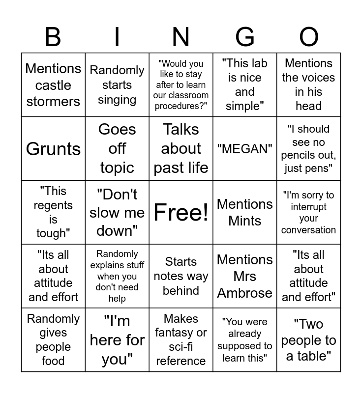 This bingo card has a free space and 28 words: "Its all about attitude and effort", Starts talking about letters of recommendation, "MEGAN", "You were already supposed to learn this", Grunts, "Would you like to stay after to learn our classroom procedures?", Randomly starts singing, "Its all about attitude and effort, Mentions Mints, Randomly gives people food, "This regents is tough", "This lab is nice and simple", "I'm here for you", Makes fantasy or sci-fi reference, "I should see no pencils out, just pens", "It's in the directions", Randomly explains stuff when you don't need help, Goes off topic, Talks about past life, Starts notes way behind, Mentions castle stormers, "You know where I keep all of my pencils and rulers", "Two people to a table", "Don't slow me down", "I'm sorry to interrupt your conversation, Mentions Mrs Ambrose, Mentions the voices in his head and "Be observant".