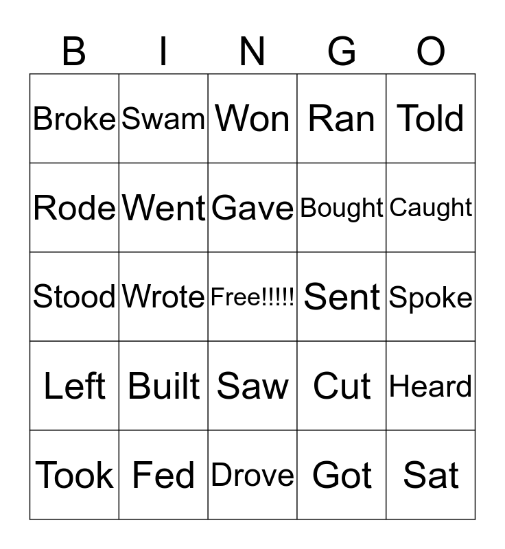 This bingo card has a free space and 39 words: Fell, Said, Made, Went, Took, Saw, Gave, Thought, Told, Left, Wrote, Ran, Sat, Spoke, Sent, Built, Drew, Broke, Spent, Cut, Rode, Drove, Bought, Caught, Drank, Ate, Hid, Read, Slept, Swam, Taught, Sang, Won, Fed, Got, Found, Heard, Stood and Held.