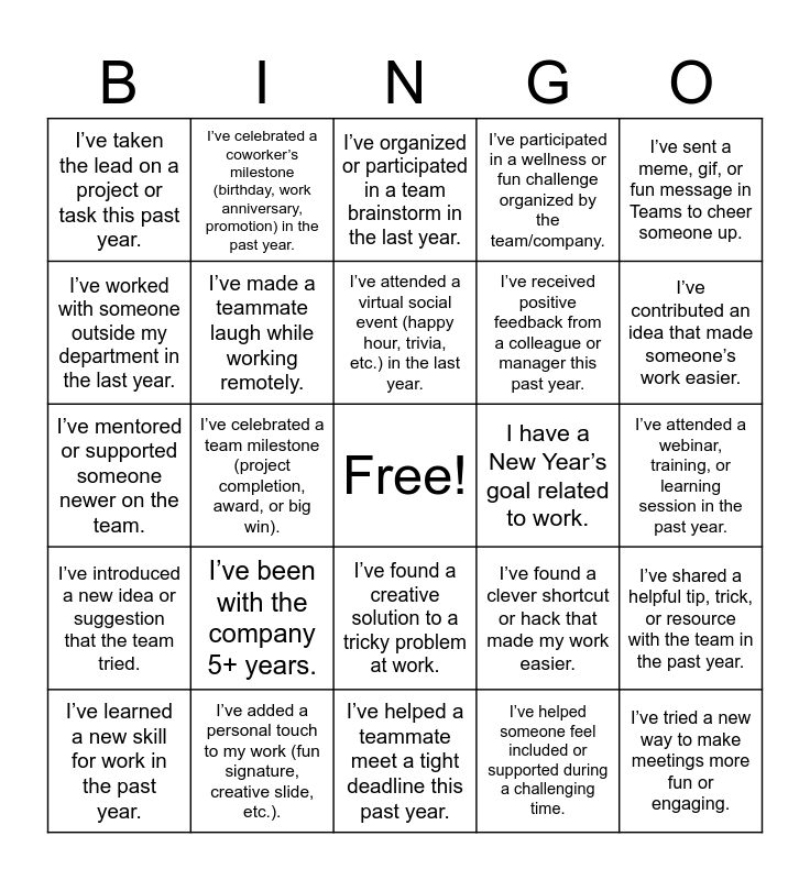 This bingo card has a free space and 25 words: I’ve been with the company 5+ years., I’ve helped a teammate meet a tight deadline this past year., I’ve attended a virtual social event (happy hour, trivia, etc.) in the last year., I’ve learned a new skill for work in the past year., I’ve sent a meme, gif, or fun message in Teams to cheer someone up., I’ve taken the lead on a project or task this past year., I’ve worked with someone outside my department in the last year., I’ve celebrated a coworker’s milestone (birthday, work anniversary, promotion) in the past year., I have a New Year’s goal related to work., I’ve found a creative solution to a tricky problem at work., I’ve received positive feedback from a colleague or manager this past year., I’ve mentored or supported someone newer on the team., I’ve found a clever shortcut or hack that made my work easier., I’ve shared a helpful tip, trick, or resource with the team in the past year., I’ve made a teammate laugh while working remotely., I’ve shared a story or lesson learned from past experience at work., I’ve attended a webinar, training, or learning session in the past year., I’ve organized or participated in a team brainstorm in the last year., I’ve contributed an idea that made someone’s work easier., I’ve celebrated a team milestone (project completion, award, or big win)., I’ve tried a new way to make meetings more fun or engaging., I’ve added a personal touch to my work (fun signature, creative slide, etc.)., I’ve introduced a new idea or suggestion that the team tried., I’ve participated in a wellness or fun challenge organized by the team/company. and I’ve helped someone feel included or supported during a challenging time..