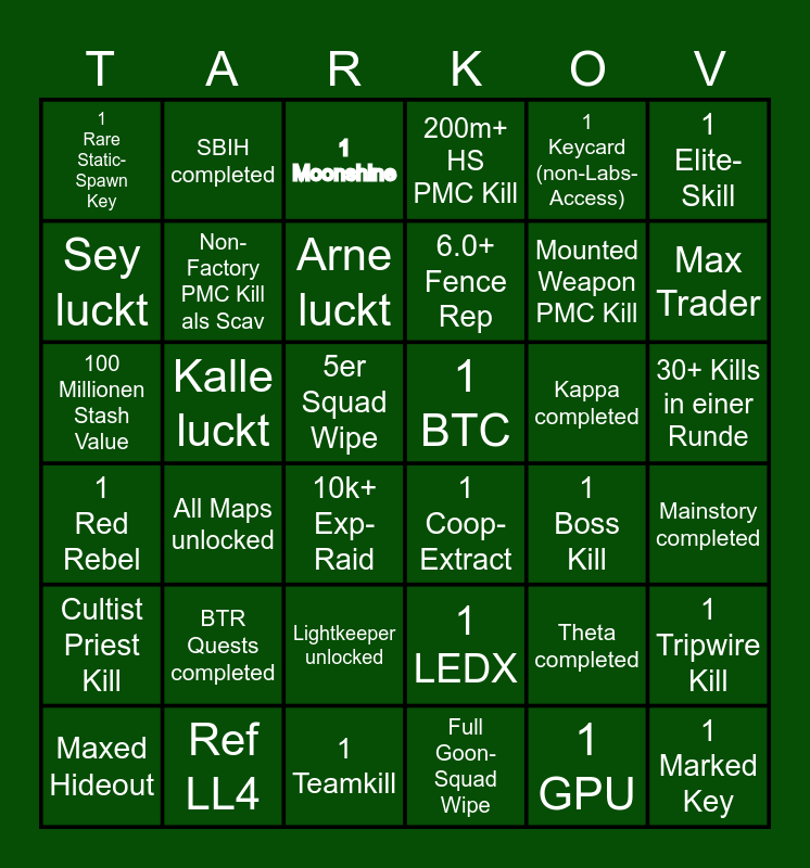 This bingo card has 36 words: 1 LEDX, Lightkeeper unlocked, Full Goon-Squad Wipe, Sey luckt, 1 Red Rebel, 1 BTC, Non-Factory PMC Kill als Scav, 1 Teamkill, 1 Keycard (non-Labs-Access), Theta completed, Max Trader, 200m+ HS PMC Kill, 1 Tripwire Kill, Kalle luckt, 6.0+ Fence Rep, 1 Rare Static-Spawn Key, Cultist Priest Kill, Kappa completed, 100 Millionen Stash Value, 1 Moonshine, 5er Squad Wipe, All Maps unlocked, 1 Coop-Extract, 10k+ Exp-Raid, 1 Boss Kill, SBIH completed, Mounted Weapon PMC Kill, Ref LL4, Arne luckt, 1 Elite-Skill, 1 Marked Key, Maxed Hideout, Mainstory completed, 30+ Kills in einer Runde, BTR Quests completed and 1 GPU.