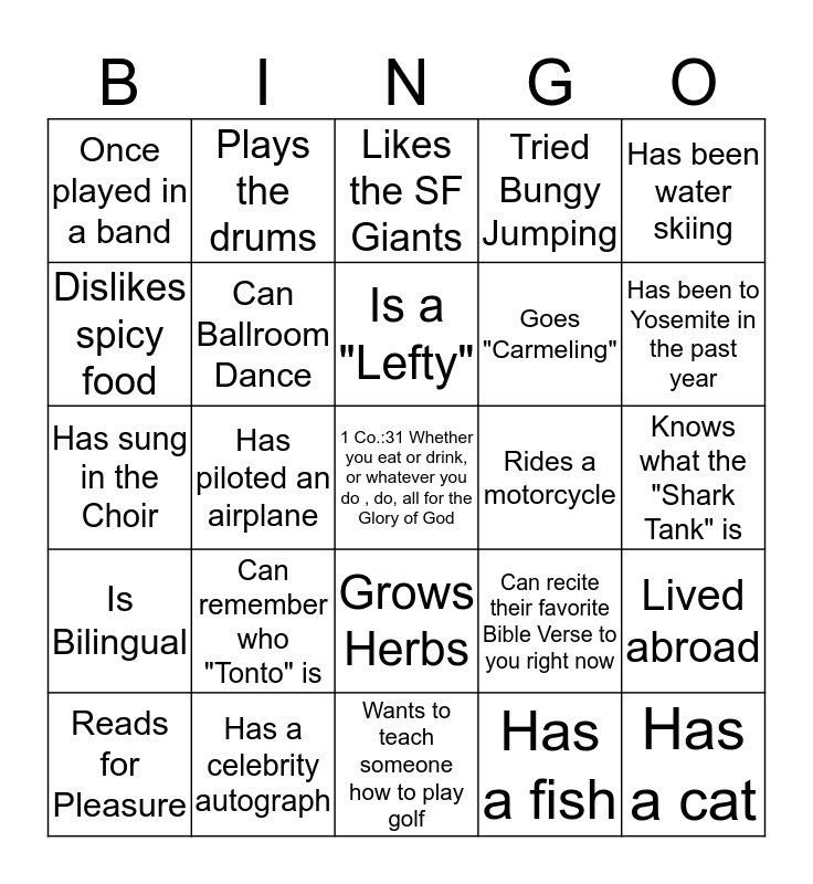 This bingo card has a free space and 24 words: Can remember who "Tonto" is, Has a celebrity autograph, Is a "Lefty", Reads for Pleasure, Has been water skiing, Once played in a band, Dislikes spicy food, Plays the drums, Rides a motorcycle, Grows Herbs, Goes "Carmeling", Has sung in the Choir, Can recite their favorite Bible Verse to you right now, Lived abroad, Can Ballroom Dance, Has a fish, Knows what the "Shark Tank" is, Likes the SF Giants, Has been to Yosemite in the past year, Has piloted an airplane, Has a cat, Is Bilingual, Tried Bungy Jumping and Wants to teach someone how to play golf.