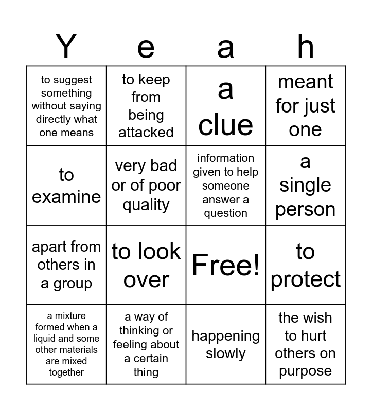 This bingo card has 21 words: a way of thinking or feeling about a certain thing, to say or admit that one has done something wrong, to keep from being attacked, to speak for something or somone, happening slowly, information given to help someone answer a question, to suggest something without saying directly what one means, a clue, Free!, a single person, apart from others in a group, meant for just one, the wish to hurt others on purpose, a feeling of great unhappiness, very bad or of poor quality, the answer to a problem or puzzle, a mixture formed when a liquid and some other materials are mixed together, to look over, to examine, to protect and to argue in favor of.