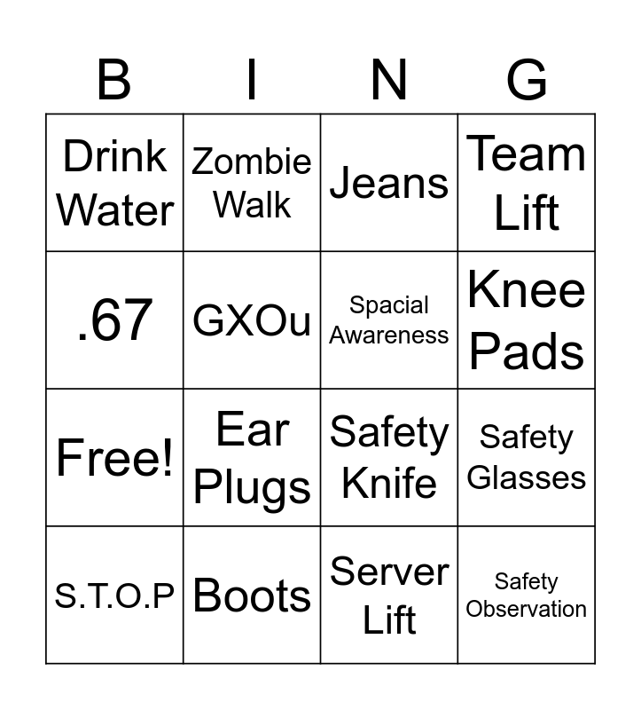 This bingo card has 20 words: Safety Glasses, Sleeves, Jeans, PPE, S.T.O.P, .67, Boots, Drink Water, Free!, Zombie Walk, Ear Plugs, Safety Knife, GXOu, Safety Observation, Spacial Awareness, Safety Family, Knee Pads, Team Lift, Server Lift and Tug Test.