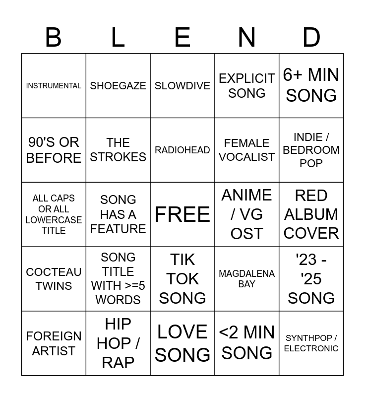This bingo card has a free space and 24 words: SONG TITLE WITH >=5 WORDS, HIP HOP / RAP, RADIOHEAD, FOREIGN ARTIST, 6+ MIN SONG, INSTRUMENTAL, 90'S OR BEFORE, SHOEGAZE, ANIME / VG OST, TIK TOK SONG, FEMALE VOCALIST, ALL CAPS OR ALL LOWERCASE TITLE, MAGDALENA BAY, '23 - '25 SONG, THE STROKES, <2 MIN SONG, RED ALBUM COVER, SLOWDIVE, INDIE / BEDROOM POP, SONG HAS A FEATURE, SYNTHPOP / ELECTRONIC, COCTEAU TWINS, EXPLICIT SONG and LOVE SONG.