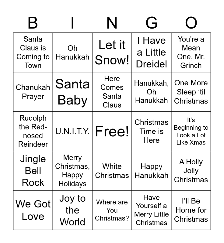 This bingo card has a free space and 41 words: Mary, Did You Know?, Rudolph the Red-nosed Reindeer, Happy Kwanzaa, Santa Baby, Joy to the World, White Christmas, Here Comes Santa Claus, All I Want for Christmas is You, You’re a Mean One, Mr. Grinch, Jingle Bell Rock, U.N.I.T.Y., I Have a Little Dreidel, I’ll Be Home for Christmas, It’s Beginning to Look a Lot Like Xmas, Christmas Time is Here, Merry Christmas, Happy Holidays, Rock of Ages, Santa Claus is Coming to Town, Chanukah Song, Let it Snow!, A Holly Jolly Christmas, Rockin’ Around the Xmas Tree, Where are You Christmas?, Hanukkah, Oh Hanukkah, Last Christmas, Silent Night, Have Yourself a Merry Little Christmas, Baby It’s Cold Outside, One More Sleep ‘til Christmas, Wonderful Christmastime, It’s the Most Wonderful Time of the Year, Oh Hanukkah, We Got Love, Carol of the Bells, Happy Hanukkah, Chanukah Prayer, Feliz Navidad, The Christmas Song, Frosty the Snowman, Christmas (Baby Please Come Home) and The Little Drummer Boy.