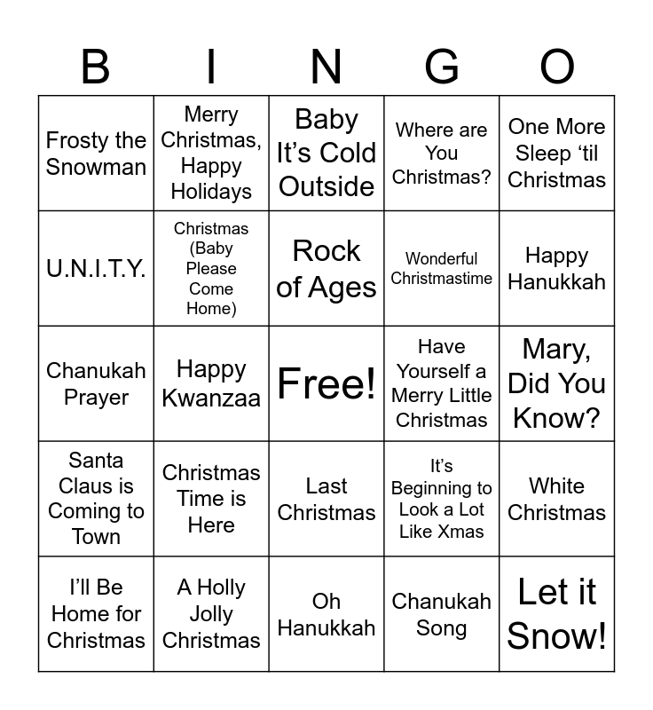 This bingo card has a free space and 41 words: Rockin’ Around the Xmas Tree, Chanukah Prayer, Rudolph the Red-nosed Reindeer, Christmas (Baby Please Come Home), A Holly Jolly Christmas, Last Christmas, Rock of Ages, We Got Love, One More Sleep ‘til Christmas, Santa Claus is Coming to Town, Happy Kwanzaa, Where are You Christmas?, Let it Snow!, Mary, Did You Know?, Have Yourself a Merry Little Christmas, Christmas Time is Here, Silent Night, Frosty the Snowman, Joy to the World, Baby It’s Cold Outside, White Christmas, All I Want for Christmas is You, Oh Hanukkah, Wonderful Christmastime, It’s the Most Wonderful Time of the Year, Jingle Bell Rock, Chanukah Song, Carol of the Bells, Happy Hanukkah, I Have a Little Dreidel, Santa Baby, Merry Christmas, Happy Holidays, I’ll Be Home for Christmas, Feliz Navidad, It’s Beginning to Look a Lot Like Xmas, U.N.I.T.Y., Hanukkah, Oh Hanukkah, Here Comes Santa Claus, The Little Drummer Boy, The Christmas Song and You’re a Mean One, Mr. Grinch.