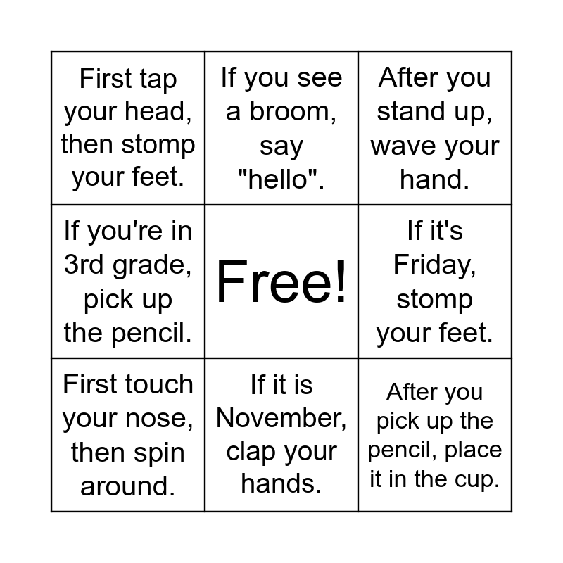 This bingo card has a free space and 8 words: If it's Friday, stomp your feet., After you stand up, wave your hand., If you see a broom, say "hello"., First touch your nose, then spin around., First tap your head, then stomp your feet., After you pick up the pencil, place it in the cup., If you're in 3rd grade, pick up the pencil. and If it is November, clap your hands..