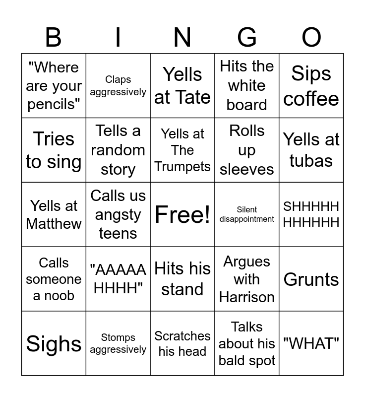 This bingo card has a free space and 25 words: Sighs, "AAAAA HHHH", Yells at The Trumpets, Talks about his bald spot, Yells at tubas, "Where are your pencils", Claps aggressively, Yells at Tate, Rolls up sleeves, Grunts, Yells at Matthew, Tells a random story, Argues with Harrison, "WHAT", Tries to sing, Stomps aggressively, Scratches his head, Hits the white board, SHHHHH HHHHHH, Calls someone a noob, Calls us angsty teens, Hits his stand, Silent disappointment, Sips coffee and Yells at the people in the hallway for being too loud.