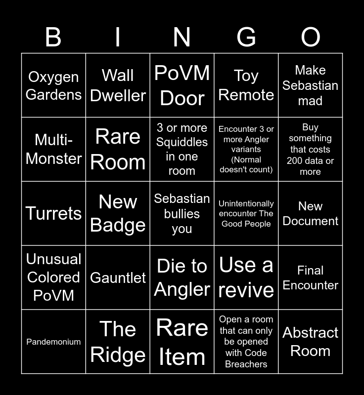 This bingo card has a free space and 24 words: Pandemonium, Gauntlet, 3 or more Squiddles in one room, Open a room that can only be opened with Code Breachers, Make Sebastian mad, Oxygen Gardens, Wall Dweller, PoVM Door, Unintentionally encounter The Good People, New Document, Turrets, Rare Room, Use a revive, Final Encounter, Multi-Monster, The Ridge, Rare Item, Toy Remote, Buy something that costs 200 data or more, Unusual Colored PoVM, New Badge, Die to Angler, Encounter 3 or more Angler variants (Normal doesn't count) and Abstract Room.