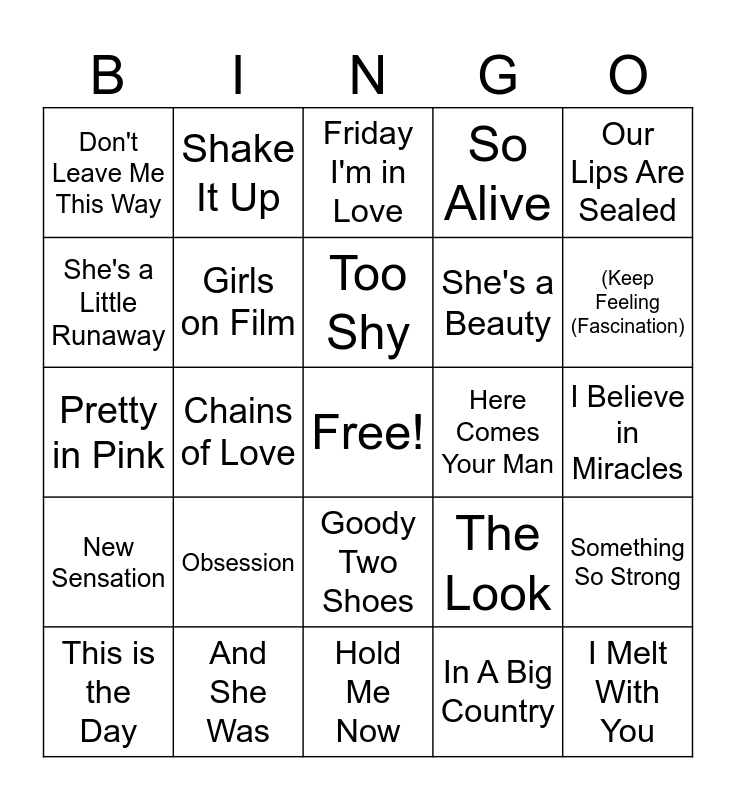 This bingo card has a free space and 30 words: And She Was, Burning Down The House, Chains of Love, Dance Hall Days, Don't Leave Me This Way, Friday I'm in Love, Girls on Film, Goody Two Shoes, Here Comes Your Man, Hold Me Now, I Believe in Miracles, I Melt With You, In A Big Country, It's My Life, (Keep Feeling (Fascination), Lips Like Sugar, The Look, New Sensation, Obsession, Our Lips Are Sealed, Pretty in Pink, The Safety Dance, Shake It Up, She's a Beauty, She's a Little Runaway, So Alive, Something So Strong, This is the Day, Too Shy and Veronica.