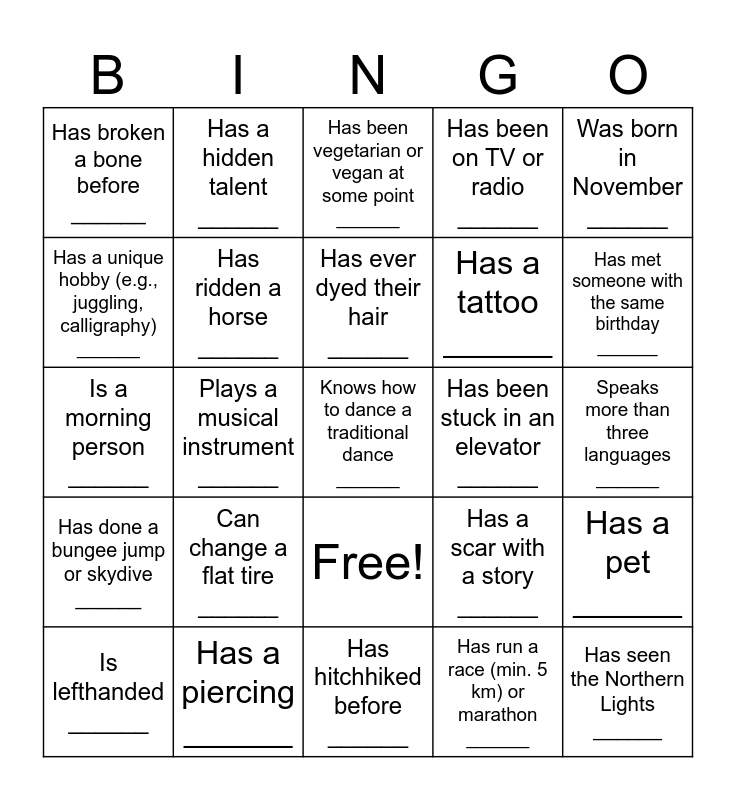 This bingo card has 26 words: Free!, Has run a race (min. 5 km) or marathon ______, Has ever dyed their hair ______, Has a piercing ______, Was born in November ______, Has broken a bone before ______, Has a unique hobby (e.g., juggling, calligraphy) ______, Has a hidden talent ______, Speaks more than three languages ______, Has a scar with a story ______, Has a tattoo ______, Is a morning person ______, Has a pet ______, Is lefthanded ______, Plays a musical instrument ______, Is not afraid of spiders ______, Has been on TV or radio ______, Has done a bungee jump or skydive ______, Has been vegetarian or vegan at some point ______, Knows how to dance a traditional dance ______, Has met someone with the same birthday ______, Has hitchhiked before ______, Has been stuck in an elevator ______, Can change a flat tire ______, Has ridden a horse ______ and Has seen the Northern Lights ______.