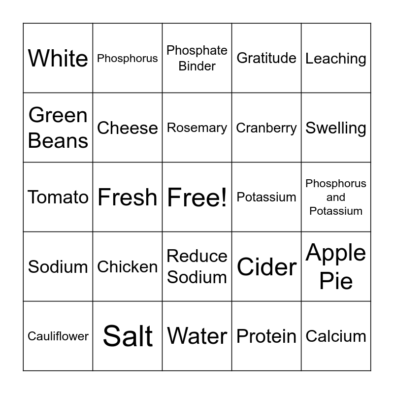 This bingo card has a free space and 24 words: Chicken, Salt, Rosemary, Cauliflower, Leaching, White, Green Beans, Phosphorus, Potassium, Reduce Sodium, Cranberry, Tomato, Cider, Apple Pie, Cheese, Protein, Phosphorus and Potassium, Phosphate Binder, Swelling, Fresh, Calcium, Sodium, Gratitude and Water.