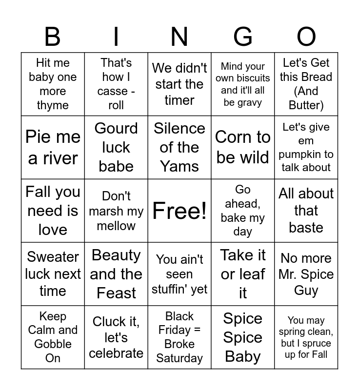 This bingo card has a free space and 24 words: Beauty and the Feast, Cluck it, let's celebrate, Silence of the Yams, Keep Calm and Gobble On, Let's Get this Bread (And Butter), Hit me baby one more thyme, Pie me a river, That's how I casse - roll, Go ahead, bake my day, You ain't seen stuffin' yet, Corn to be wild, Fall you need is love, Take it or leaf it, No more Mr. Spice Guy, Gourd luck babe, Spice Spice Baby, All about that baste, We didn't start the timer, Let's give em pumpkin to talk about, Don't marsh my mellow, You may spring clean, but I spruce up for Fall, Sweater luck next time, Mind your own biscuits and it'll all be gravy and Black Friday = Broke Saturday.