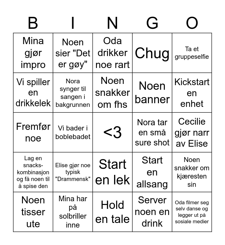 This bingo card has a free space and 29 words: Noen tisser ute, Noen tar en shot, Vi bader i boblebadet, Cecilie danser salsa, Mina gjør impro, Oda drikker noe rart, Nora synger til sangen i bakgrunnen, Elise gjør noe typisk "Drammensk", Nora tar en små sure shot, Mina har på solbriller inne, Cecilie gjør narr av Elise, Oda filmer seg selv danse og legger ut på sosiale medier, Hold en tale, Server noen en drink, Kickstart en enhet, Start en skål, Start en lek, Lag en snacks- kombinasjon og få noen til å spise den, Ta et gruppeselfie, Fremfør noe, Start en allsang, Karpe spilles, Noen banner, Vi spiller en drikkelek, Chug, Noen sier "Det er gøy", Noen snakker om kjæresten sin, Noen snakker om fhs and Vi mimrer om de rare folkene vi møtte på fhs.