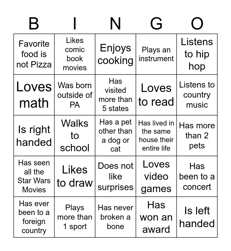 This bingo card has a free space and 29 words: Has ever been to a foreign country, Has thrown-up at school, Walks to school, Has more than 2 siblings, Favorite food is not Pizza, Enjoys cooking, Was born outside of PA, Likes to draw, Has lived in the same house their entire life, Plays more than 1 sport, Has more than 2 pets, Is left handed, Has never broken a bone, Has won an award, Listens to country music, Loves to dance, Does not like surprises, Has seen all the Star Wars Movies, Listens to hip hop, Is right handed, Loves video games, Has tried sushi, Loves to read, Loves math, Plays an instrument, Likes comic book movies, Has been to a concert, Has visited more than 5 states and Has used power tools.
