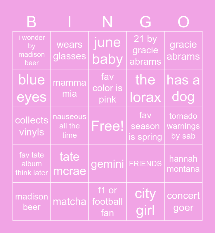 This bingo card has a free space and 24 words: tate mcrae, matcha, fav color is pink, madison beer, gracie abrams, i wonder by madison beer, blue eyes, wears glasses, fav season is spring, gemini, the lorax, collects vinyls, FRIENDS, hannah montana, mamma mia, city girl, tornado warnings by sab, june baby, has a dog, nauseous all the time, concert goer, fav tate album think later, 21 by gracie abrams and f1 or football fan.
