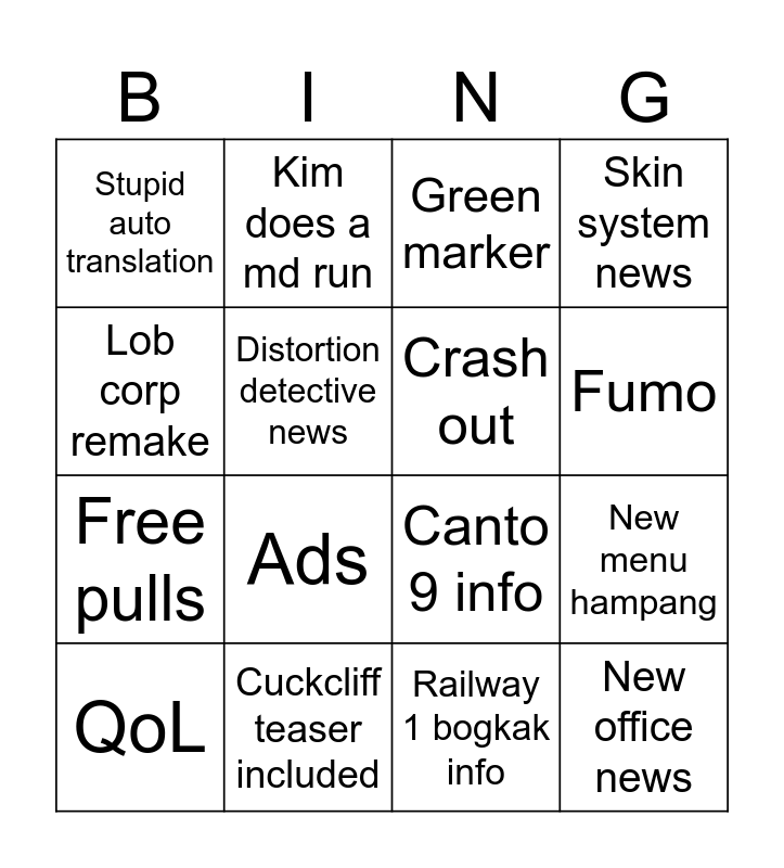 This bingo card has 16 words: Cuckcliff teaser included, New menu hampang, Green marker, Stupid auto translation, Free pulls, Kim does a md run, Canto 9 info, Railway 1 bogkak info, Lob corp remake, Distortion detective news, QoL, Skin system news, Ads, Fumo, Crash out and New office news.