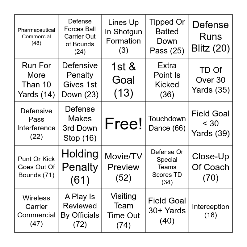 This bingo card has a free space and 75 words: Incomplete Pass (1), Handoff (2), Lines Up In Shotgun Formation (3), Pass Complete To Running Back (4), Pass Play Results In First Down (5), 3rd & 10+ (6), 3rd Down Conversion (7), Goes For It On 4th Down (8), Converts on 4th Down (9), QB Gains Yards By Running (10), Delay Of Game Penalty (11), False Start/Illegal Formation (12), 1st & Goal (13), Run For More Than 10 Yards (14), Pass Complete For More Than 20 Yards (15), Defense Makes 3rd Down Stop (16), Defense Makes A 4th Down Stop (17), Interception (18), Fumble Recovered By D (19), Defense Runs Blitz (20), Offsides Encroachment or Neutral Zone Infraction (21), Defensive Pass Interference (22), Defensive Penalty Gives 1st Down (23), Defense Forces Ball Carrier Out of Bounds (24), Tipped Or Batted Down Pass (25), Pass Is Broken Up By Defender (26), Defender Celebrates After A Play (27), QB Gets Sacked (28), Tackle For Loss (Not On QB) (29), Forced Field Goal Inside 20 (30), QB Scores By Running (31), Passing TD (32), Rushing TD (Not By QB) (33), Defense Or Special Teams Scores TD (34), TD Of Over 30 Yards (35), Extra Point Is Kicked (36), Score From Inside The 10 (37), Field Goal Missed (38), Field Goal < 30 Yards (39), Field Goal 30+ Yards (40), 2nd FG Scored (Per Quarter) (41), Visiting Team Scores (42), Home Team Scores (43), Score Tied (Not At 0-0) (44), 10+ points scored (Per Quarter) (45), Restaurant / Fast Food Commercial (46), Wireless Carrier Commercial (47), Pharmaceutical Commercial (48), Beer / Liquor Commercial (49), Car Commercial (50), Lawyer / Insurance Commercial (51), Movie/TV Preview (52), Sportsbetting Commercial (53), Credit Card/Banking Commercial (54), Commercial For Another Sport (55), Female Sideline Reporter On Screen (56), Aerial View Of Stadium (57), Slow Motion Replay (58), Replay With Computer Animation On Screen (59), Fan In Face Paint or Costume (60), Holding Penalty (61), Punt Is A Touchback (62), Kickoff Is A Touchback (63), Fair Catch Made (64), Kickoff/Punt Return Attempted (65), Touchdown Dance (66), Injured Player on Screen (67), Player Stats Shown On Screen (68), Offensive Player Points Downfield on 1st Down (69), Close-Up Of Coach (70), Punt Or Kick Goes Out Of Bounds (71), A Play Is Reviewed By Officials (72), Home Team Time Out (73), Visiting Team Time Out (74) and TV Commercial With NFL Player (75).