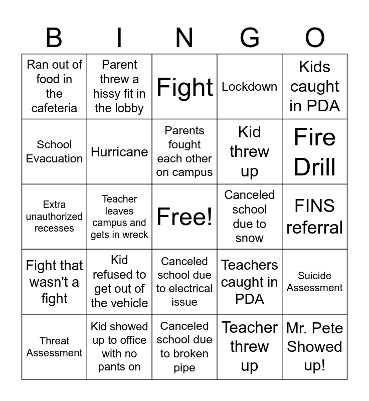 This bingo card has a free space and 24 words: Kid refused to get out of the vehicle, Kid showed up to office with no pants on, Parents fought each other on campus, Threat Assessment, Kids caught in PDA, Ran out of food in the cafeteria, School Evacuation, Parent threw a hissy fit in the lobby, Canceled school due to snow, Canceled school due to electrical issue, Kid threw up, Extra unauthorized recesses, Teachers caught in PDA, Suicide Assessment, Hurricane, Teacher threw up, FINS referral, Fight, Fire Drill, Teacher leaves campus and gets in wreck, Mr. Pete Showed up!, Fight that wasn't a fight, Lockdown and Canceled school due to broken pipe.