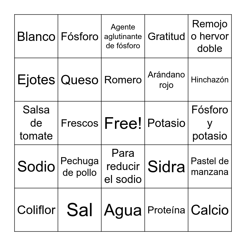 This bingo card has a free space and 24 words: Pechuga de pollo, Sal, Romero, Coliflor, Remojo o hervor doble, Blanco, Ejotes, Fósforo, Potasio, Para reducir el sodio, Arándano rojo, Salsa de tomate, Sidra, Pastel de manzana, Queso, Proteína, Fósforo y potasio, Agente aglutinante de fósforo, Hinchazón, Frescos, Calcio, Sodio, Gratitud and Agua.