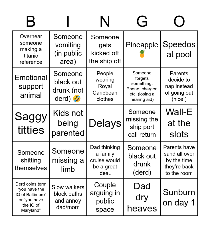 This bingo card has a free space and 31 words: Couple arguing in public space, Gentle Parenting, Kids not being parented, Pool or other kids area is closed or shut down., Overhear someone making a titanic reference, Someone gets kicked off the ship off, Someone black out drunk (not derd) 🤣, Someone black out drunk (derd), Someone missing the ship port call return, Dad dry heaves, Wall-E at the slots, Sunburn on day 1, Medical emergency, Mom and dad decide to never do a cruise again bc they don’t like people, Parents decide to nap instead of going out (nice!), Beach pigs bite, Parents have sand all over by the time they’re back to the room, Someone missing a limb, Someone shitting themselves, Dad thinking a family cruise would be a great idea.., Speedos at pool, Busted biscuits dress, Derd coins term “you have the IQ of Baltimore” or “you have the IQ of Maryland”, Someone vomiting (in public area), Someone forgets something. Phone, charger, etc. (losing a hearing aid), Emotional support animal, Pineapple 🍍, Saggy titties, Slow walkers block paths and annoy dad/mom, People wearing Royal Caribbean clothes and Old person falling down.